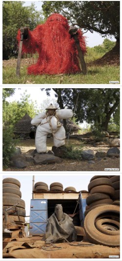 Culture Ailleurs, Compagnie Gorgrlou, Ethiouar (Sénégal oriental), 2020.L'agriculture , les sols malmenés avec les pesticides... Matériau de fabrication : Rembourrage coton, rafles de maïs, arachides, calebasse de kdg, pulvérisateur de pesticide, toile de jute, chapeau d’agriculteur, cloche des bovins et caprins